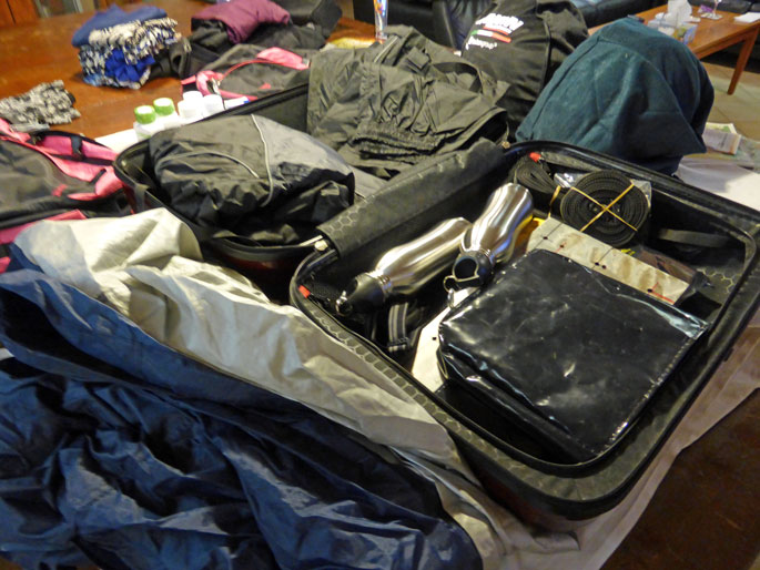 The sifting and sorting begins with what we must fit in cases and what is optional. The first trip of a series is always a challenge with a lot of bike gear so we are confident we have what we need to start the trip The list includes helmets, boots, gloves, neck warmers, kevlar jeans. waterproof suits, bike covers and the list goes on……and that’s not even looking at regular clothes. We ultimately leave the worn out bike stuff behind so never as much to bring back (thankfully). Now I start making lists and laying clothes out and gradually culling things to a manageable size (I hope).